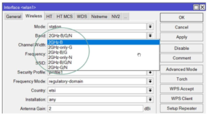 Dalam MikroTik ada yang namanya Band, Band adalah Mode Frekuensi dari perangkat Wireless. Bisa dilihat ini beberapa pilihan Band pada wireless MikroTik.
