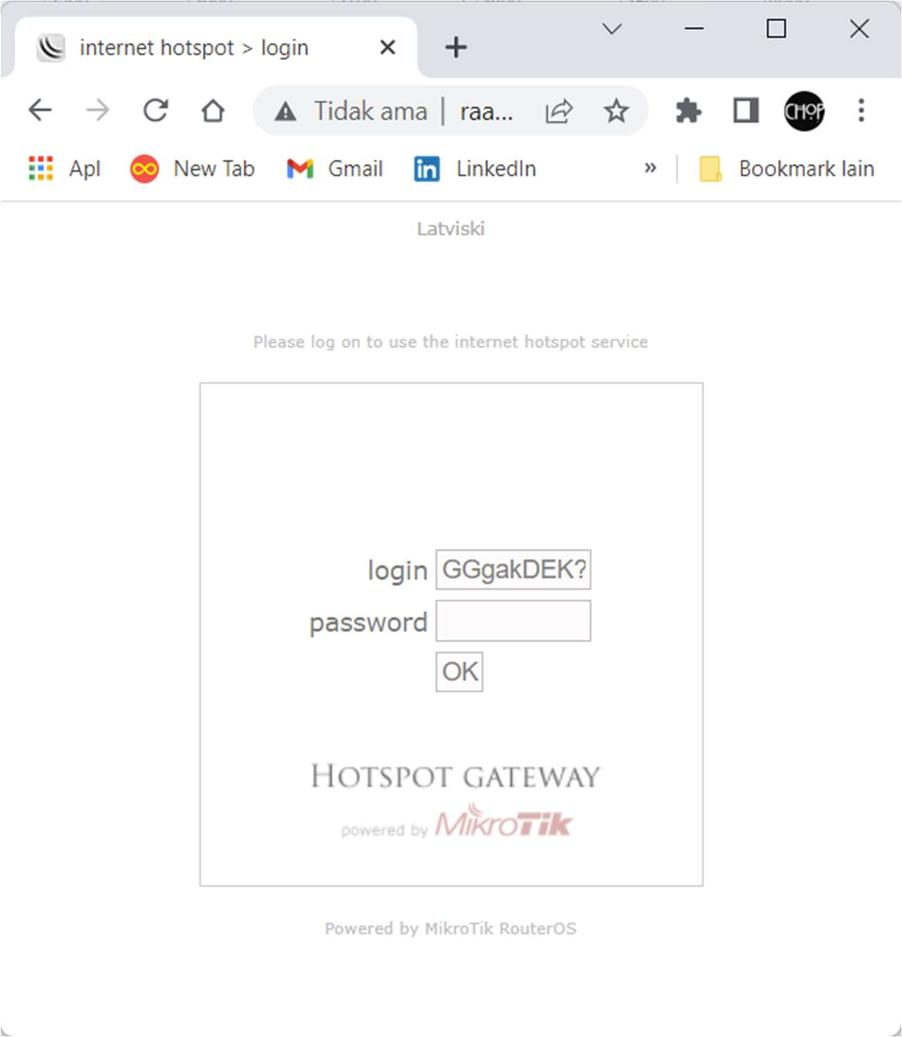 Sekarang bisa coba lagi kita logout dari Hotspot kemudian login Kembali. Maka hasil yang didapatkan adalah kita telah bisa memasukan User Login secara manual yang berarti bisa berganti User.