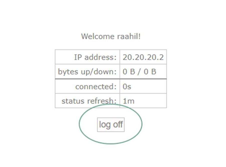 Setelah terhubung mungkin kita akan mendapati kita tidak bisa login Kembali ke hotspot kita karena yang terjadi adalah kita terlogin secara otomatis. Untuk mencobanya bisa klik log off.