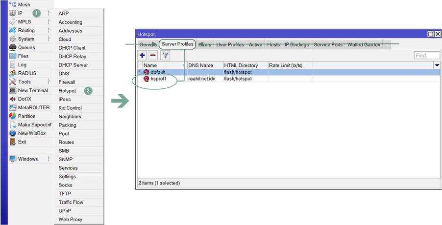 Maka solusinya kita bisa membuat sedikit perubahan pada konfigurasi Hotspot Server. Langsung masuk menu [IP] ⯈ lalu klik [Hotspot] ⯈ pindah ke tab [Server Profiles] ⯈ klik 2x hsprof1 yakni Profile Server Hotspot yang tadi kita buat.