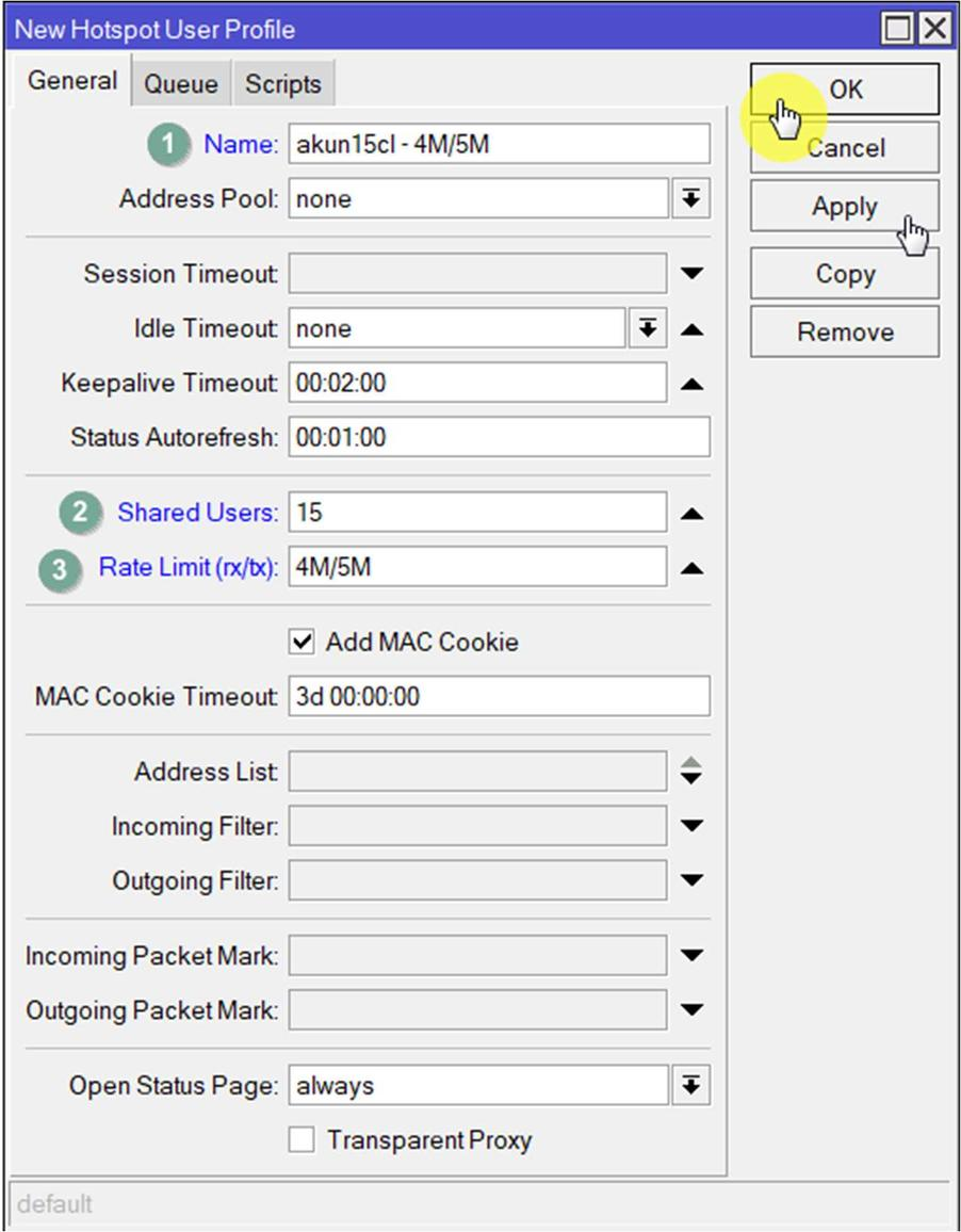 Pada pengaturan New User Profile disini terdapat parameter Shared User dan diikuti dengan parameter Rate Limit dibawahnya. Isilah kedua Parameter tersebut dengan jumlah maksimal pengguna akun Hotspot dan maksimal kecepatan Upload/Download sang akun. Aturlah parameter sebagai berikut :