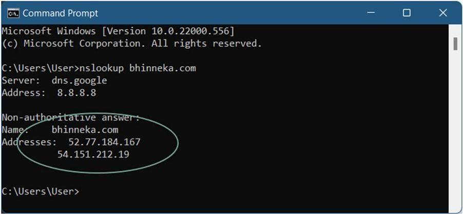 Selanjutnya adalah melihat IP address dari domain yang akan diblokir menggunakan nslookup.