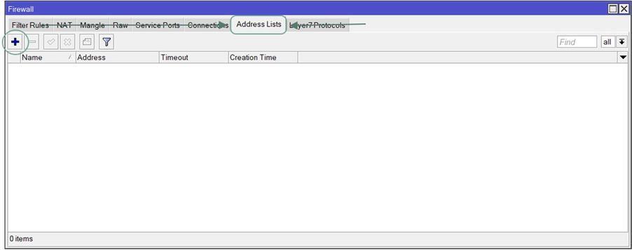 Setelah mengetahui IP address langkah selanjutnya adalah masuk ke Filter Rule Firewall dengan cara klik IP lalu klik Firewall lalu pilih menu address List. Setelah masuk ke menu address List lalu klik “+” atau add.