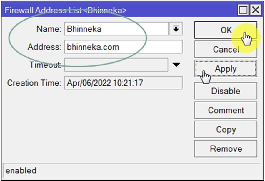 Selanjutnya Pada Firewall address List cukup masukkan nama website yang ingin kita block pada address sedangkan untuk nama bisa bebas lalu bisa apply dan Ok.