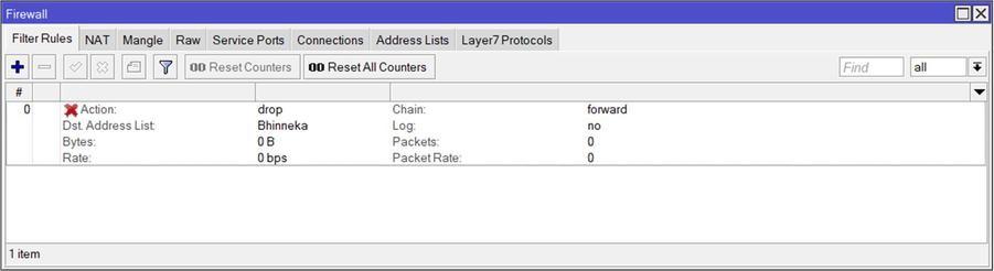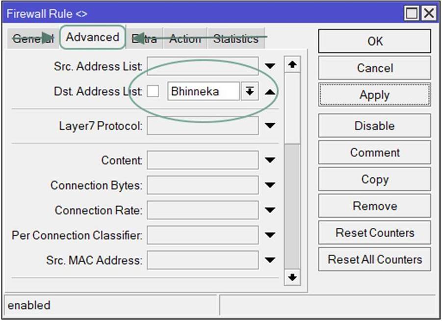 advanced pada Firewall Rule, pada bagian Dst. address List pilih daftar IP address yang telah dibuat sebelumnya, lalu masuk ke menu action, pada action pilih drop lalu klik apply dan Ok.