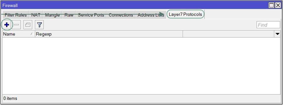 Jadi pertama Masuk ke Firewall dengan cara klik IP lalu klik Firewall lalu klik Layer Protocols. Setelah masuk ke menu Layer 7 Protocols klik “+” atau add.
