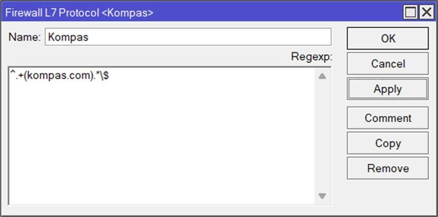 Stelah masuk ke jendela Firewall L7 Protocol lalu masukkan domain dari situs yang akan diblokir dengan menuliskan “^.+(nama_domain).*/$” lalu klik apply lalu klik OK.