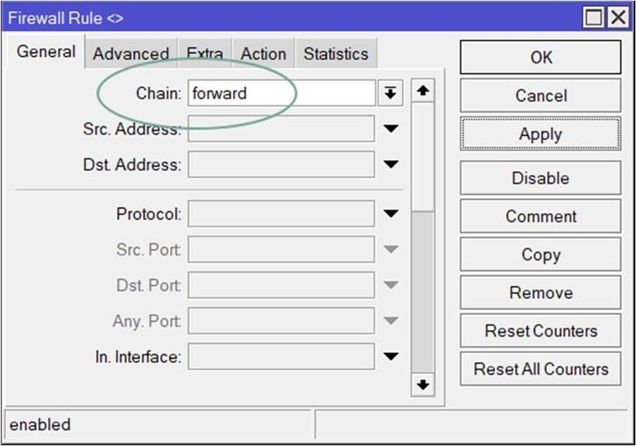 Setelah selesai membuat domain, Setelah itu kita dapat masuk ke menu Filter Rule lalu klik “+” atau add. Setelah masuk ke jendela Firewall Rule klik menu General dan pada daftar Chain pilih Forward lalu dilanjutnkan ke menu advanced lalu pada daftar Layer 7 Protocol