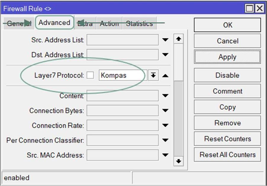 Jadi di lab ini kita juga dapat melakukan pemblokiran menggunakan Regexp melalui Layer 7 Protocols pada Firewall.