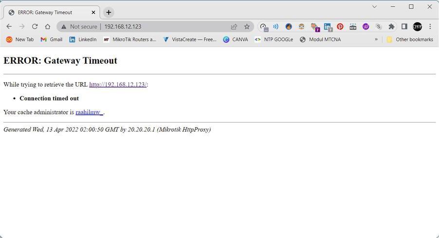 Maka saat kita klik enter kemudian menunggu untuk beberapa saat hasil yang muncul adalah sebuah halaman ERROR : Gateway Timeout bisa dilihat hasil lab ini dengan sebelumnya akan sama.. Disitu juga tertera informasi Cahce administrator yang berisi nama yang tadi kita atur di pengaturan Web Proxy.