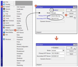 Untuk menghindari ketidakpastian akan akurasi waktuya makanya kita akan mengkonfigurasi NTP client pada routerboard kita. Protokol ini memang dibuat untuk dapat bekerja dengan baik agar device dapat mensingkronkan waktu karena terkadang ada website yang tidak bisa dibuka jika waktu kita tidak singkron dengan waktu yang ada di internet dalam kondisi tertentu router harus bekerja bedasarkan waktu,baik tanggal maupun jam.
