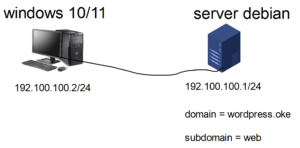 sebagai contoh kasus, kita diminta untuk membuat sebuah dns server dengan domain wordpress.oke dengan topologi jaringan sebagai berikut