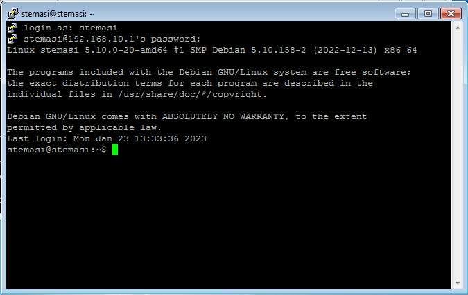 Jika setelah mengklik “Accept” anda dialihkan ke tampilan login, berarti anda telah berhasil terkoneksi ke server. Sebenarnya, sampai tahap ini anda sudah berhasil terhubung ke server untuk melakukan remote dengan menggunakan SSH. Jika anda ingin melanjutkan prosesnya, masukkan username dan password server Linux Debian anda. Jika berhasil login, maka anda akan melihat seperti pada Gambar 13.7.