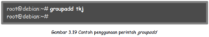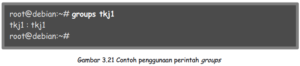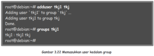 Perintah pertama (adduser tkj1 tkj) artinya memasukkan user tkj1 ke group tkj. Dibuktikan dengan perintah kedua (groups tkj1) bahwa saat ini user tkj1 juga merupakan anggota dari group tkj. Jika ingin memasukkan user tkj2, tkj3, dan tkj4 ke group tkj, perintah yang digunakan sama.
