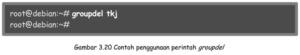 Perintah ini digunakan untuk menghapus sebuah group. Berikut contoh penggunaan perintah ini saat mencoba menghapus sebuah group dengan nama tkj yang telah dibuat sebelumnya.