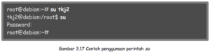 Perintah ini digunakan untuk berpindah ke user lain. Format penulisan dari perintah ini adalah su nama_user. Perhatikan perintah pertama (su tkj2) menunjukkan perintah untuk berpindah ke user tkj2. Perhatikan bash pada baris kedua (tkj2@debian:/root$), terlihat bahwa usernya sudah berubah menjadi tkj2. Begitu juga tandanya juga berubah dari (#) menjadi ($) yang menandakan bahwa tkj2 adalah user biasa. Selanjutnya jika kita hanya menggunakan perintah su saja, itu tandanya kita ingin berpindah ke user root (lihat perintah kedua).