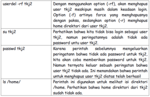 Perintah diatas digunakan untuk membuat sebuah user dengan nama tkj1. Selanjutnya perintah passwd digunakan untuk memberikan password pada user tkj1. Perhatikan bahwa penulisan password tidak ditampilkan di layar.