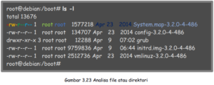 Perintah diatas adalah perintah melihat isi direktori /boot dengan detail (ls -l). Berikut penjelasan masing-masing detail yang diberikan