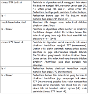 Perintah ini digunakan untuk merubah hak akses suatu file/direktori. Perintah ini memanfaatkan konversi bilangan biner ke desimal yang merepresentasikan hak akses rwx (read, write, executable). Perhatikan tabel berikut.