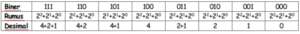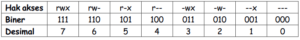 Tabel diatas menunjukkan hubungan antara hak akses, biner, dan desimal. Berikut tabel husus yang menunjukkan konversi angka biner ke desimal.