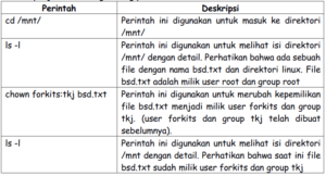Perintah ini digunakan untuk merubah kepimilikan sutau file/direktori terhadap user dan group. Berikut contoh penggunaan perintah ini