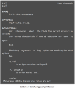 Perintah ini digunakan untuk menampilkan manual dari suatu perintah. Jadi misalkan suatu saat kita lupa apa itu fungsi dari perintah ls, kita bisa melihat manualnya dengan perintah man ls Berikut contoh keluaran dari perintah man ls