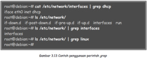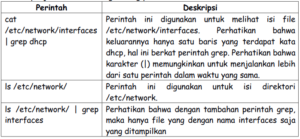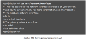 Perintah ini digunakan untuk melihat isi dari suatu file. Berikut contoh penggunaan perintah cat untuk melihat isi file /etc/network/interfaces