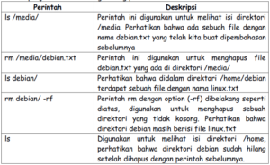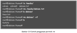 Perintah ini digunakan untuk menghapus sebuah file ataupun direktori. Berikut contoh penggunaan perintah ini
