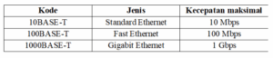 Kecepatan transmisi ethernet card dibedakan menjadi tiga kelas yaitu Standard Ethernet, Fast Ethernet dan Gigabit Ethernet. Lebih detailnya dapat dilihat pada tabel 2.1 berikut,